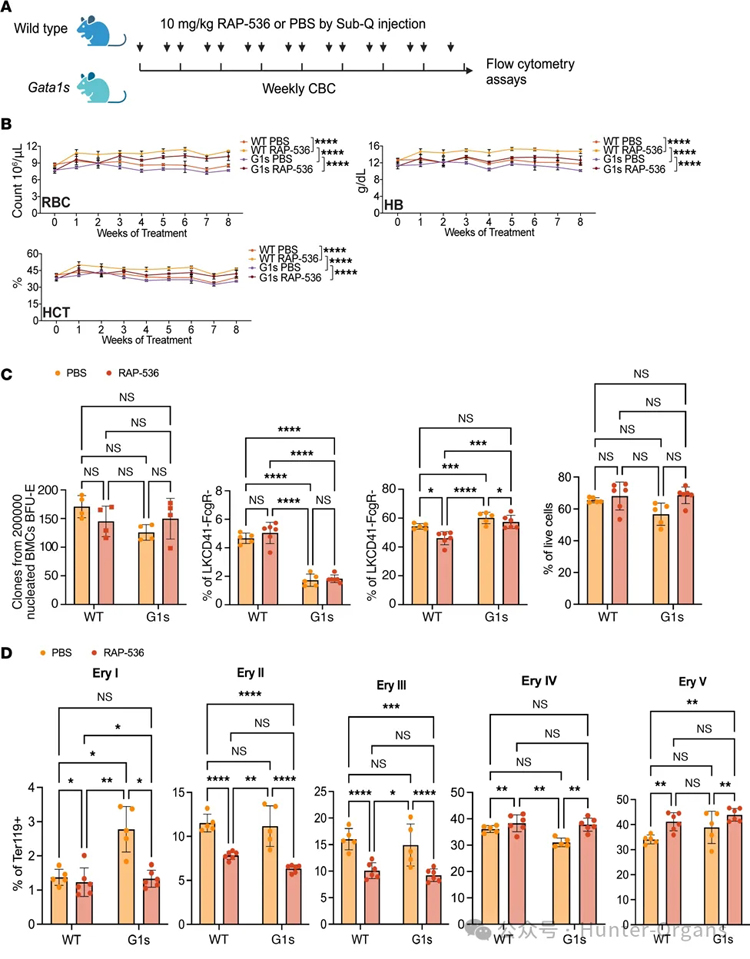 随后,研究人员通过敲除小鼠Gata1基因第2外显子 (Gata1s小鼠),来模拟持续性巨幼红细胞性贫血。在小鼠模型中,Luspatercept (RAP-536) 治疗8周后,显著改善了Gata1s小鼠的贫血状态,红细胞计数(RBC)、血红蛋白(Hb)、红细胞比容(HCT)升高,且RAP-536增加了骨髓红系祖细胞数量和成熟度。这些研究表明,GATA1的过度表达可以改善由于GATA1缺失引起的贫血,因此,研究人员推测RAP-536可能通过增加GATA1表达来克服Gata1s的低活性,从而挽救无效造血。