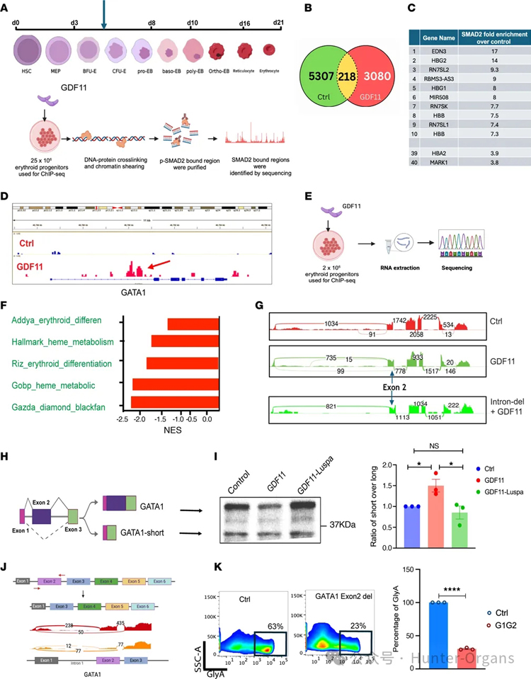 首次揭示了GDF11–SMAD2通路通过调控GATA1剪接影响红细胞生成;