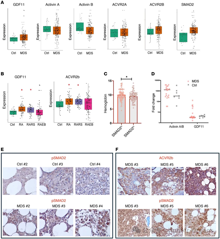 研究人员分析了183例MDS患者的CD34⁺细胞,发现相较于健康对照组,MDS患者的GDF11、ACVR2B、SMAD2的mRNA水平显著升高,而低风险MDS亚型——难治性贫血(RA)和环形铁幼粒细胞性难治性贫血(RARS)患者的GDF11和ACVR2B转录本水平更高,贫血是其主要的临床表现。此外,研究人员观察到,SMAD2表达水平较高的样本,其血红蛋白(Hb)值较低。部分MDS患者外周血浆中检测到GDF11;在GDF11水平升高的患者骨髓样本中可见pSMAD2、ACVR2B表达水平升高。