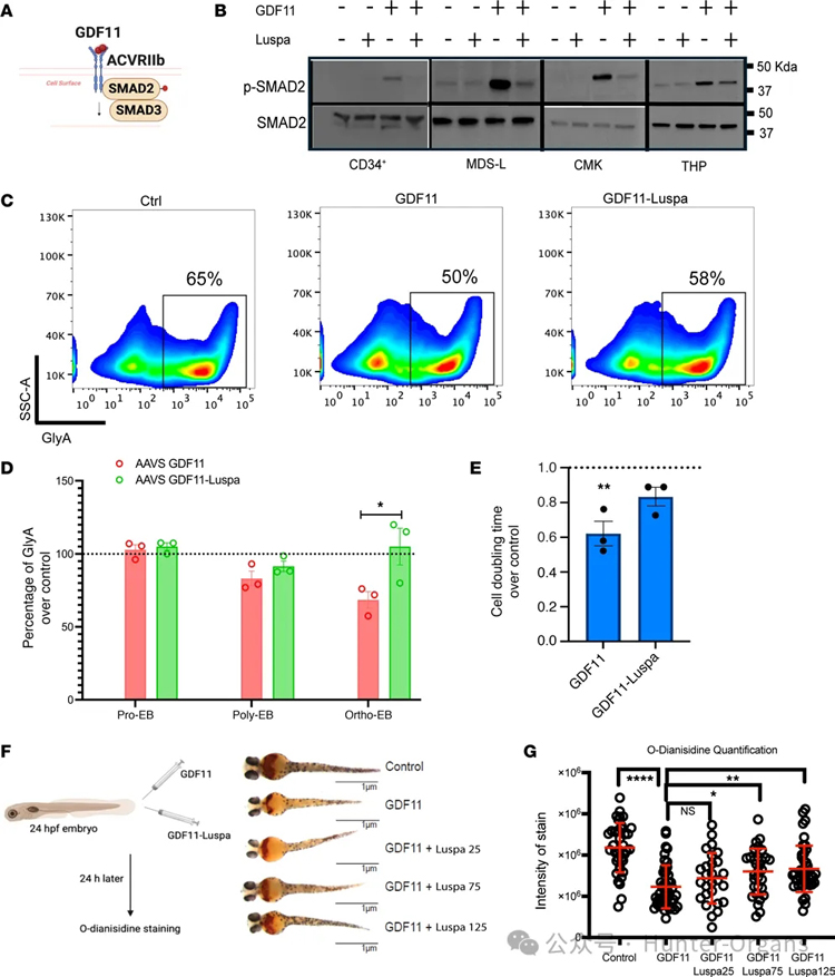 随后,研究人员发现,在人CD34⁺造血干细胞/祖细胞(HSPCs)和髓系细胞系中,GDF11可磷酸化SMAD2,而新药luspatercept可以阻断这一过程。为了确定GDF11对人类红细胞生成过程的功能影响,实验结果显示,GDF11处理红系祖细胞(BFU-E/CFU-E阶段),会导致后期红细胞成熟(GlyA⁺细胞)减少,且细胞倍增时间缩短,新药Luspatercept可逆转这些效应,这表明GDF11在红系分化的后期阶段具有抑制作用。