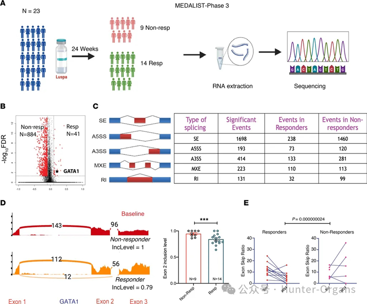 基线时,应答者与非应答者整体转录组差异不大,但RNA剪接事件存在显著差异,非应答者更多。基线时,应答者骨髓样本中GATA1外显子2跳跃事件,即GATA1s产生显著高于非应答者。经过治疗24周后,应答者的GATA1外显子2跳跃比率下降,而非应答者无此趋势或反而上升,且两组间GATA1/ GATA1s比值变化存在显著交互作用。